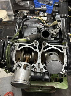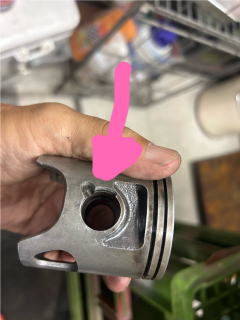 今回載せたエンジンは以前に下ろしていたものをオーバーホールしたもの。 51LでシリンダボアはSTD。 そもそもこのエンジンは使い出す前に、腰下OHも行って、クランク芯出し、ベアリングやオイルシールも交換済(そっから10,000km走ったけど)。 ポートは段差取りの修正と一次圧縮UPしている。 今回下ろして分解してみて、腰下のクランク開きなどの問題は見られなかった。 シリンダは多少摩耗は進んでいたが、まだ何とか使えるレベルだったので、耐水ペーパー#400でクロスハッチ入れ。 ピストンも同じような程度であったので、こちらは#600でクロスハッチ入れ。 しかし、ピストンを組み込み、ピストンピンクリップを入れるときに何か違和感!!!!! よく見るとピストン欠けてんじゃん!!! いつ欠けたか分からないが、これをそのまま使用するにはリスクがあるので、使えそうな中古ストックがあったのでそれに交換してエンジン組みました。 ![]() |