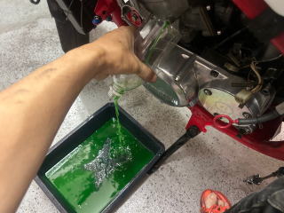 ラジエター液を抜く。 今回、ネットの記事で見かけたPETボトルを切ったものを受け皿にして抜いたら、変に垂れずキレイに抜くことが出来たお薦めである。 エンジンを下ろすときは、清酒のプラケースを横置きしたものを車体の横に置いて、フレームからエンジンを抜いてそこに置くようにしている。とにかく腰に極力負担を掛けないようにしている。 エンジン重量約30数キロ、、、、、管理人は筋力無いので、この重さでも結構ハードっす。 今回もガラスの腰は何とか持ちこたえた。 |