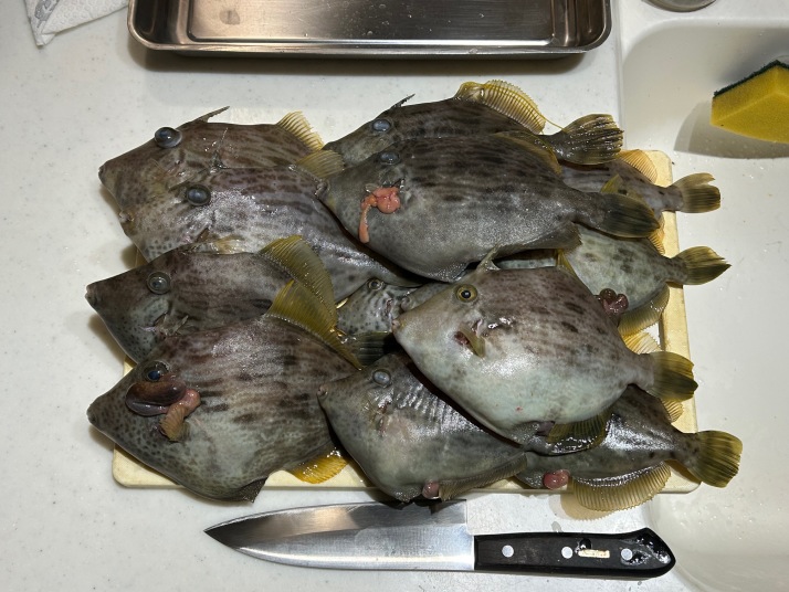 カワハギのシーズンになった。今年の東京湾カワハギはまずまずの湧きのようだ。 石川丸は普段の乗り合いはタチウオアジリレーのみだが、季節限定のカワハギとかアマダイとかアカムツなどのスポット乗り合いも季節限定で出船している。 2025年12月7日日曜中潮にてカワハギスポット乗り合いが出ると言うので行ってきた。 今日は(旧)石川丸の方なので、船頭さんの船に乗船。港に一番乗りだったので、左ミヨシの席にした。 鴨居沖からスタート!! いきなり釣れてご機嫌(^o^)、これは爆釣か!?と思ったが、そっからはポツポツ釣れたり、エサすら取られない悶絶タイムありで、やはりカワハギは難しい(-_-;) 今日はツ抜け出来るかな????とあれこれやってみたが、それほど好転せず。 当初、風が強かったので、風が収まった後半は東京湾横断で竹岡沖へ。 こっちはサバフグがいて針ごと取られることもあったが、誘いが合うタイミングでカワハギ中型サイズの連チャン!! 他の人は、30cm近いサイズが出ていたが、自分には釣れなかったが、、、 終わってみれば、MAX23cm以下20cm位の中型も多く13匹でフィニッシュ! TOP16匹だったそうなので、まあこんだけ釣れれば我が家には十分! 帰って他の船宿の釣果も見てみてたが、TOPでツ抜け出来ていない近隣船宿も結構あり、船頭さんも頑張ってポイント探してくれました!!! 翌日の宴は薄造りの刺身特盛りに肝醤油もたっぷり!!!!プリン体たっぷりの素敵な夕飯でした。 やはりカワハギの肝醤油は最高に美味い!!!!海苔巻き風に食べてもこれまた美味い!!!酒も進んでタマラン! 大型は後日の煮付けとします。カワハギの煮付けも美味いんだよなー!!! 毎シーズン、カワハギは堪能しないと!!! 本日は船頭さん、ご機嫌なカワハギを見つけてくれてありがとうございました!!! また、ヨロシク! |